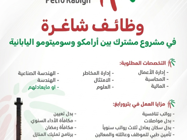 تعلن شركة بترورابغ (مشروع مشتركين بين أرامكو وسوميتومو اليابانية) عن فتح باب التوظيف لشغل (6) وظائف شاغرة حملة البكالوريوس على المسميات التالية: – محلل مالي– …