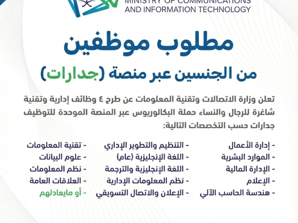 تعلن وزارة الاتصالات وتقنية المعلومات عن طرح 4 وظائف إدارية وتقنية شاغرة للرجال والنساء حملة البكالوريوس عبر المنصة الموحدة للتوظيف جدارات حسب المسميات والتخصصات التالية: …