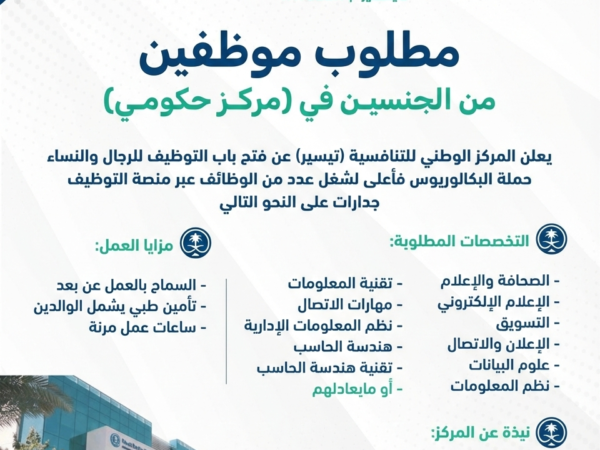 يعلن المركز الوطني للتنافسية (تيسير) عن فتح باب التوظيف للرجال والنساء حملة البكالوريوس فأعلى لشغل عدد من الوظائف عبر منصة التوظيف جدارات على النحو التالي: – …