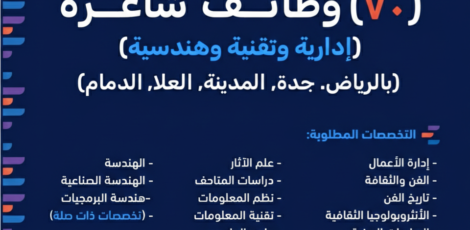 تعلن شركة إمداد الخبرات التابعة لشركة علم (شركة حكومية) عن طرح (70) وظيفة (إدارية وتقنية وهندسية) شاغرة لحملة الدبلوم والبكالوريوس فأعلى للعمل في كل من (الرياض. جدة, المدينة, العلا, الدمام) وذلك على النحو التالي: