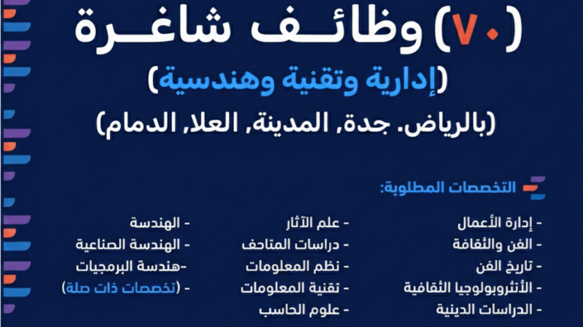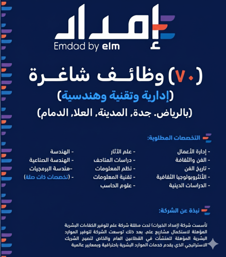 تعلن شركة إمداد الخبرات التابعة لشركة علم (شركة حكومية) عن طرح (70) وظيفة (إدارية وتقنية وهندسية) شاغرة لحملة الدبلوم والبكالوريوس فأعلى للعمل في كل من (الرياض. جدة, المدينة, العلا, الدمام) وذلك على النحو التالي: