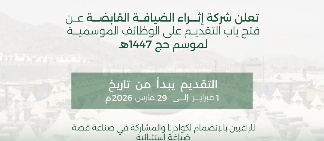 تعلن شركة إثراء الضيافة القابضة عن فتح باب التقديم على الوظائف الموسمية لموسم #حج_1447هـ، لتمكين الكفاءات الوطنية من الإسهام في إثراء تجربة ضيوف الرحمن والمشاركة في صناعة قصة ضيافة استثنائية.
