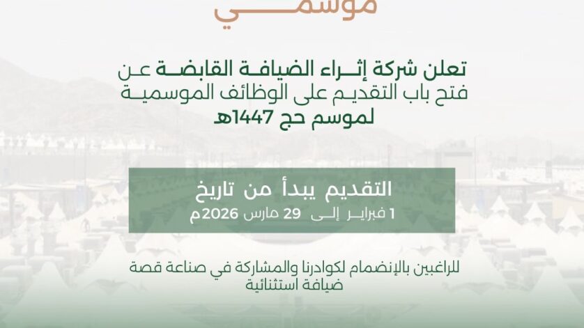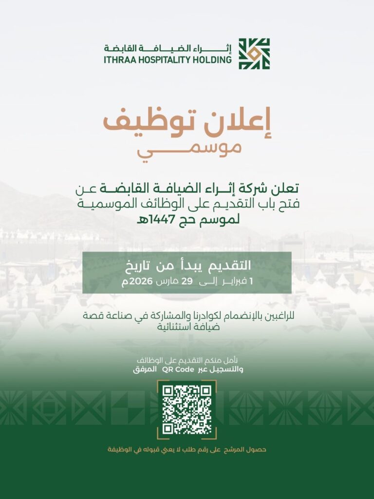 تعلن شركة ⁧‫إثراء الضيافة القابضة‬⁩ عن فتح باب التقديم على الوظائف الموسمية لموسم ⁧‫#حج_1447هـ‬⁩، لتمكين الكفاءات الوطنية من الإسهام في إثراء تجربة ضيوف الرحمن والمشاركة في صناعة قصة ضيافة استثنائية.