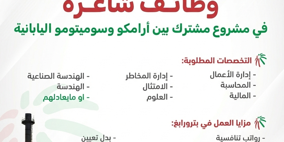 تعلن شركة بترورابغ (مشروع مشتركين بين أرامكو وسوميتومو اليابانية) عن فتح باب التوظيف لشغل (6) وظائف شاغرة حملة البكالوريوس على المسميات التالية: