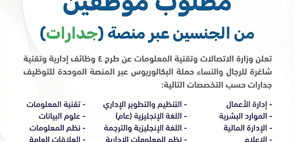 تعلن وزارة الاتصالات وتقنية المعلومات عن طرح 4 وظائف إدارية وتقنية شاغرة للرجال والنساء حملة البكالوريوس عبر المنصة الموحدة للتوظيف جدارات حسب المسميات والتخصصات التالية:
