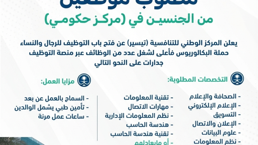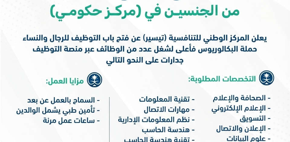 يعلن المركز الوطني للتنافسية (تيسير) عن فتح باب التوظيف للرجال والنساء حملة البكالوريوس فأعلى لشغل عدد من الوظائف عبر منصة التوظيف جدارات على النحو التالي: